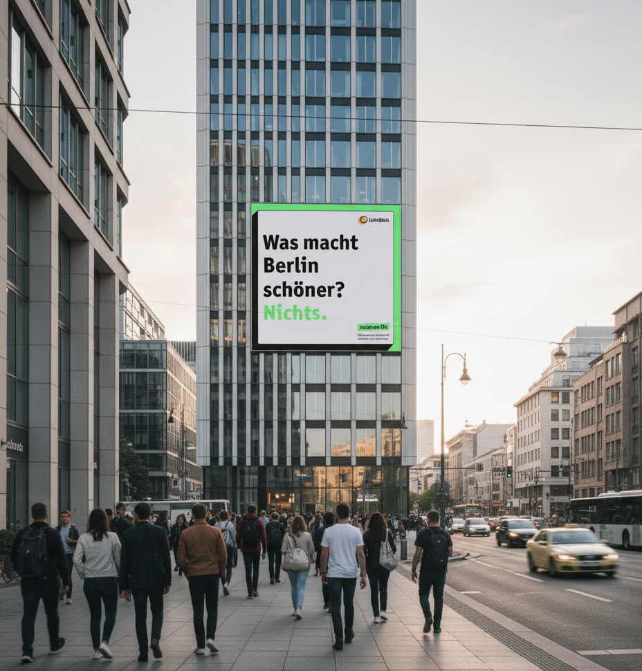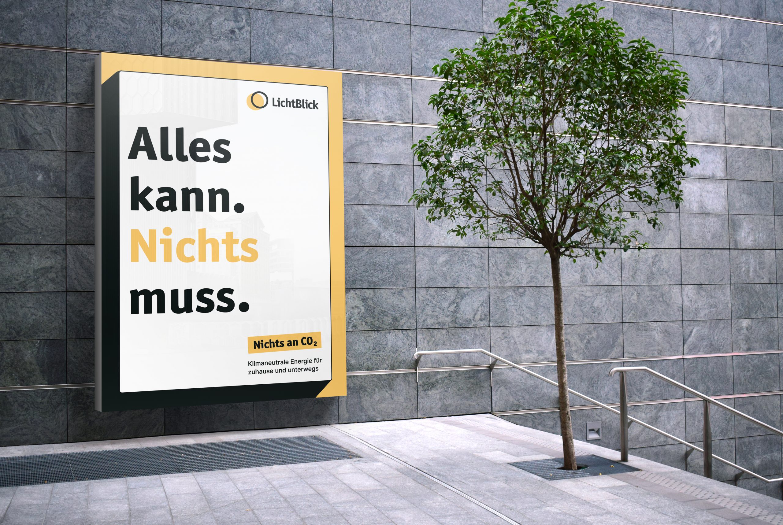 Lichtblick setzt sich seit 1998 für eine grünere Zukunft ein. Als kleiner Anbieter kommen sie mit ihrem Marketing jedoch schwer zwischen all dem Greenwashing der Großen durch. Deshalb haben wir mit dieser Kampagne bewusst auf Irritation gesetzt. „Es ist an der Zeit, sich für nichts einzusetzen – nichts an CO2“ ist bewusst provokativ gewählt, um Aufmerksamkeit für echten Klimaschutz und konkrete Reduktion von Treibhausgasen zu schaffen. Bei der Aussteuerung wurde zudem das entstandene CO2 mit Aufkauf von Zertifikaten kompensiert und die Digital Out Of Homes nur dann ausgespielt, wenn mind. 50% Ökostrom im Netz war.
